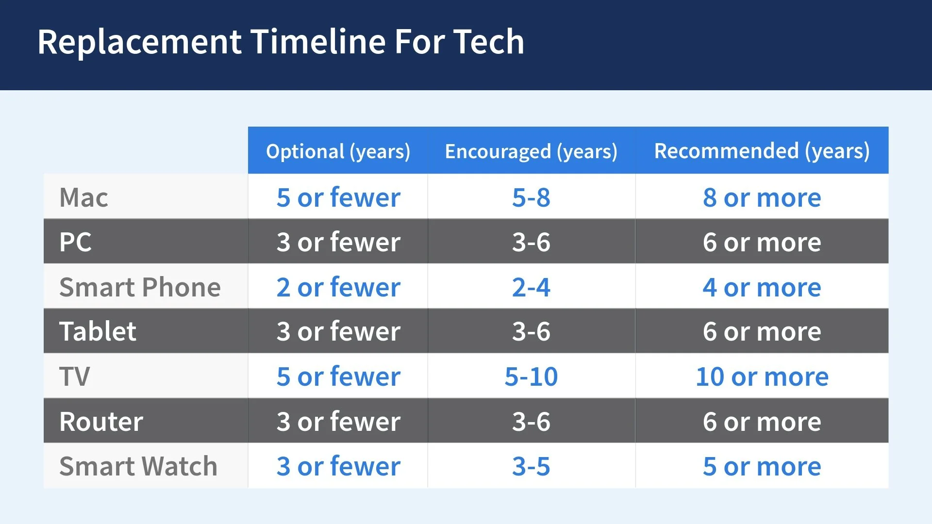 Encouraged: At this stage, the device is still functional, but newer models have better features, performance, and security. Upgrading now can help you get the most out of your technology and may also offer trade-in or donation opportunities.